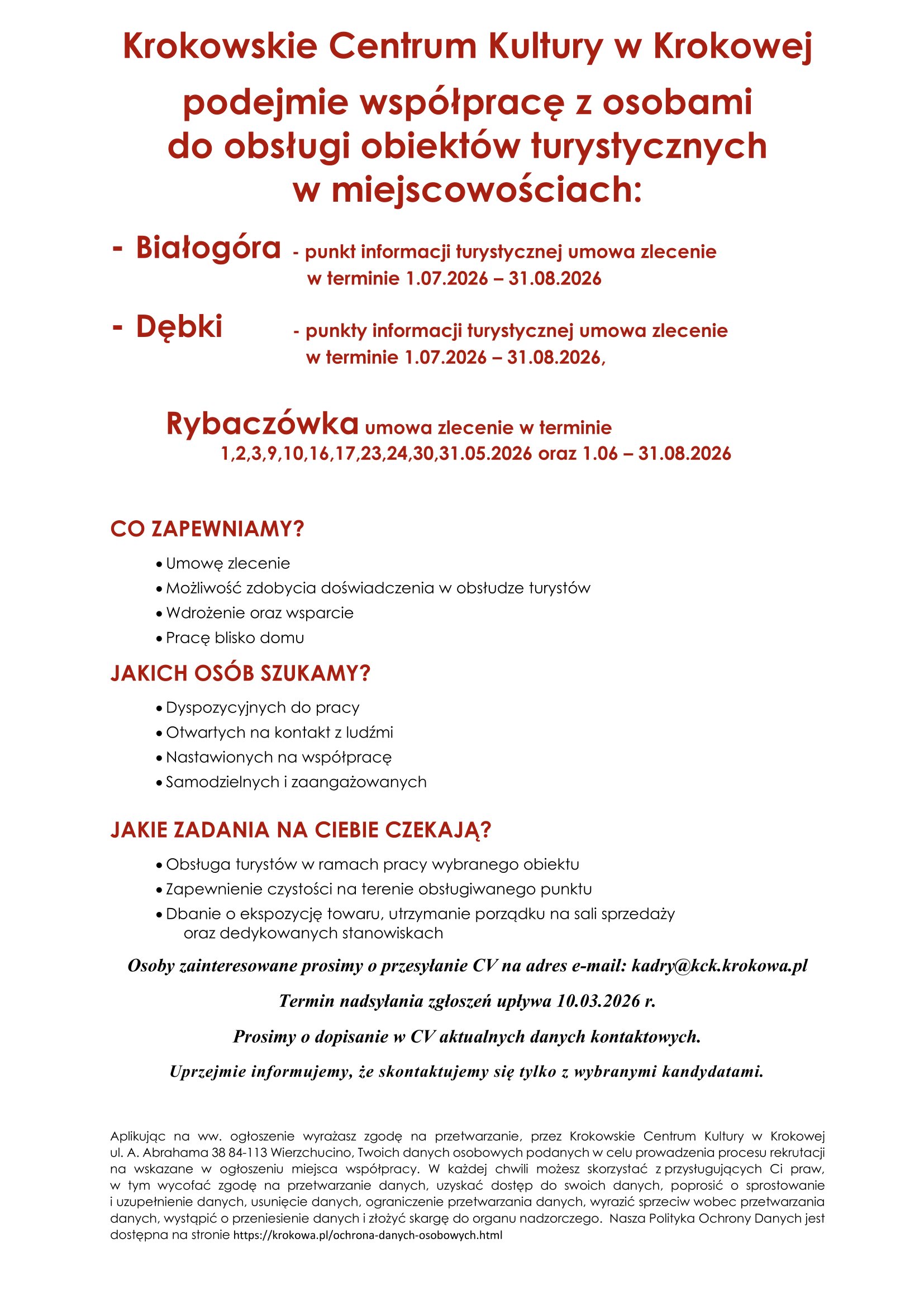 Uprzejmie informujemy, że skontaktujemy się tylko z wybranymi kandydatami. Aplikując na ww. ogłoszenie wyrażasz zgodę na przetwarzanie, przez Krokowskie Centrum Kultury w Krokowej ul. A. Abrahama 38 84-113 Wierzchucino, Twoich danych osobowych podanych w celu prowadzenia procesu rekrutacji na wskazane w ogłoszeniu miejsca współpracy. W każdej chwili możesz skorzystać z przysługujących Ci praw, w tym wycofać zgodę na przetwarzanie danych, uzyskać dostęp do swoich danych, poprosić o sprostowanie i uzupełnienie danych, usunięcie danych, ograniczenie przetwarzania danych, wyrazić sprzeciw wobec przetwarzania danych, wystąpić o przeniesienie danych i złożyć skargę do organu nadzorczego. Nasza Polityka Ochrony Danych jest dostępna na stronie https://krokowa.pl/ochrona-danych-osobowych.html